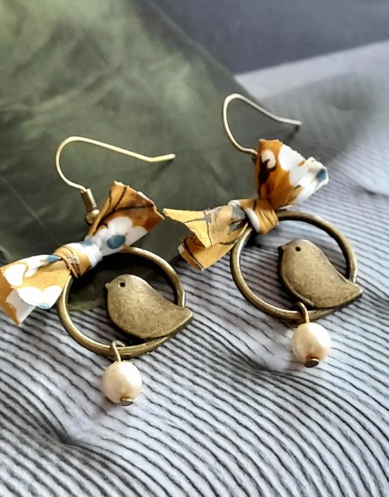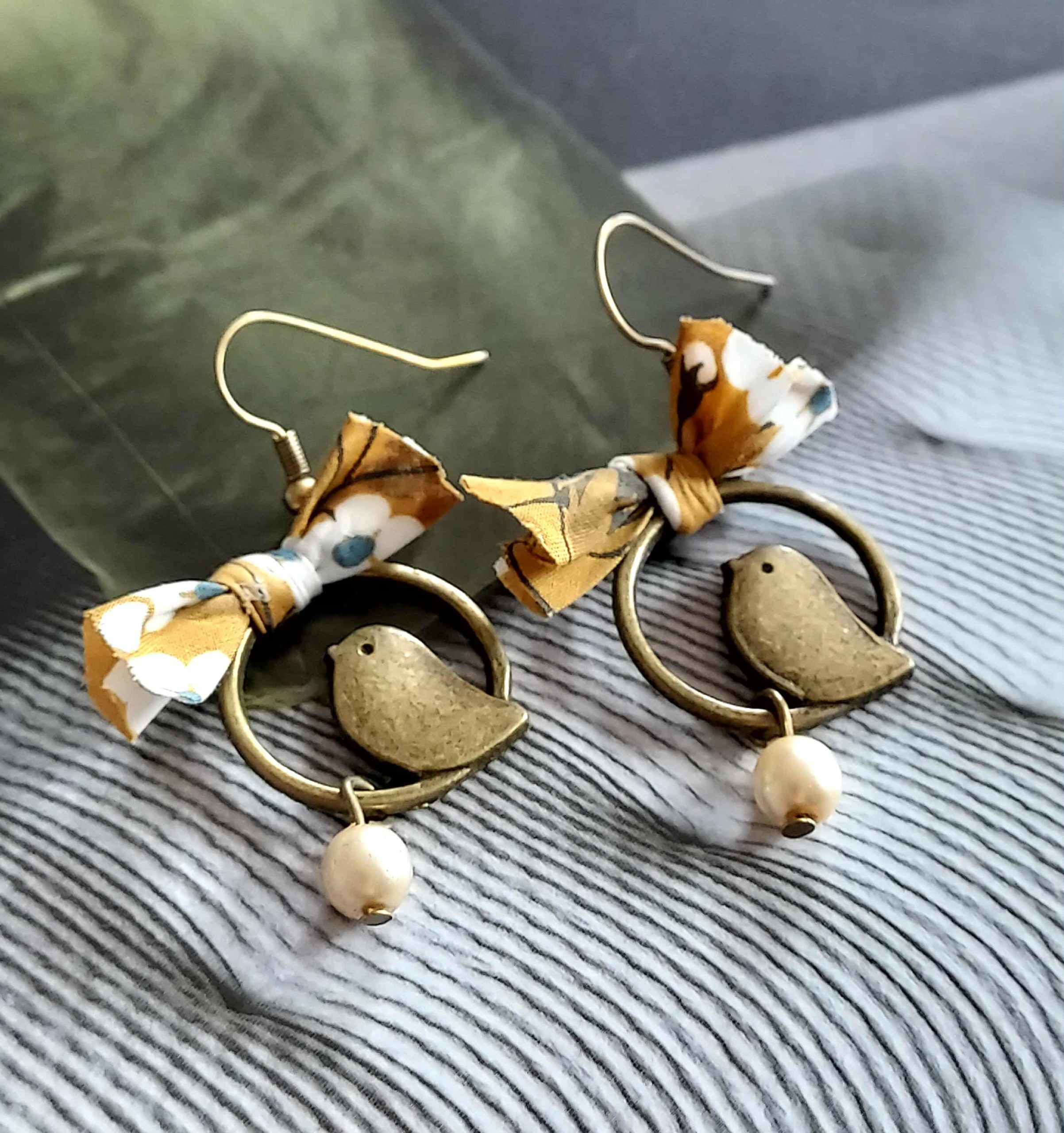 Boucles d’oreilles laiton vieilli, breloque ronde « oiseau » et nœud liberty, perle acrylique beige.