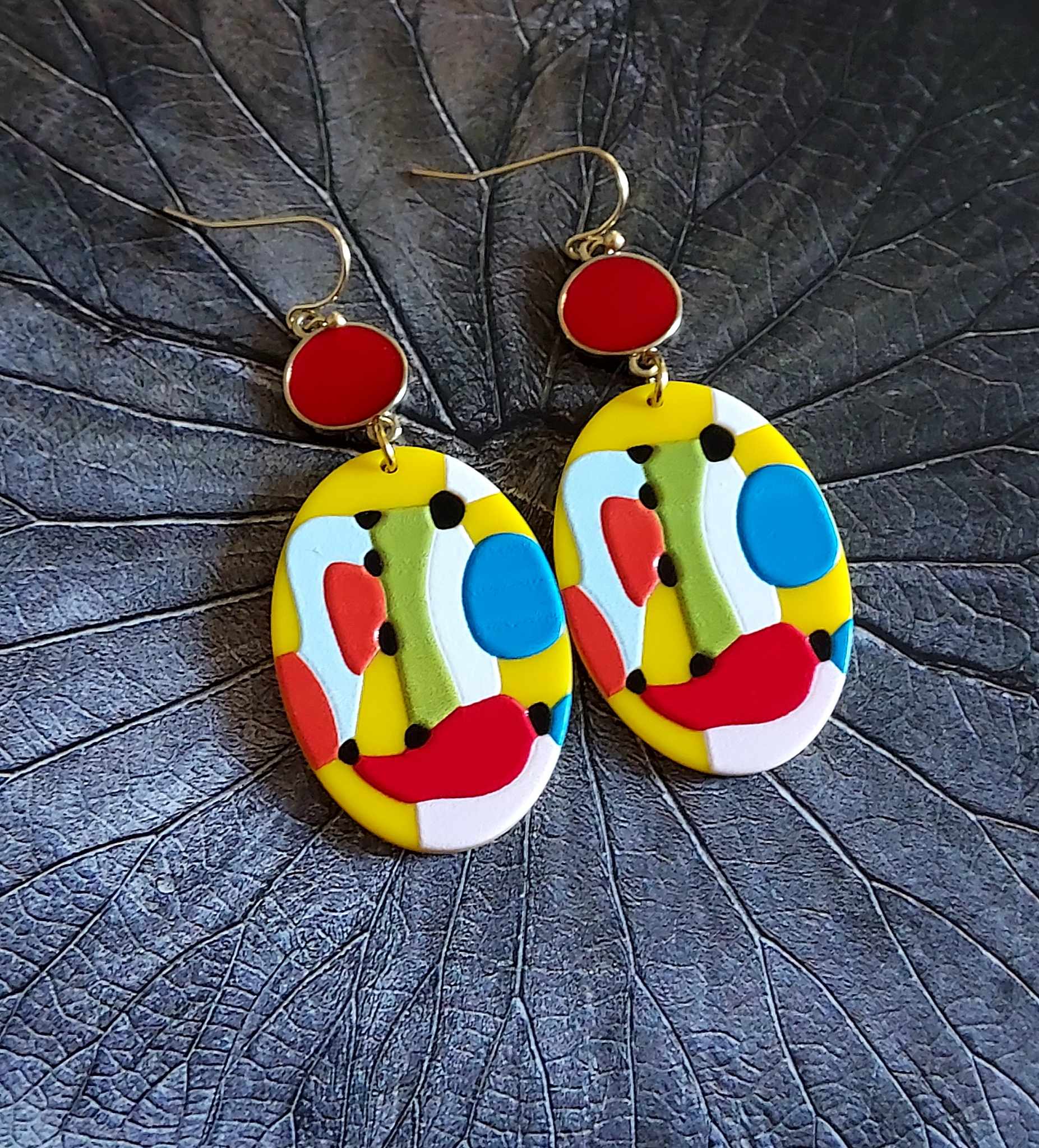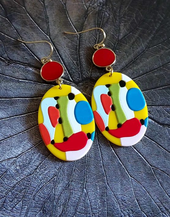 Boucles d’oreilles avec breloque acrylique ovale et intercalaire métal en résine rouge .