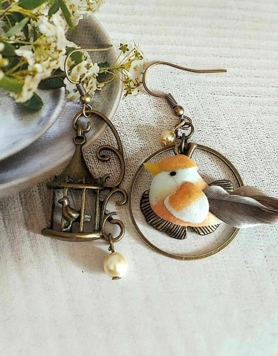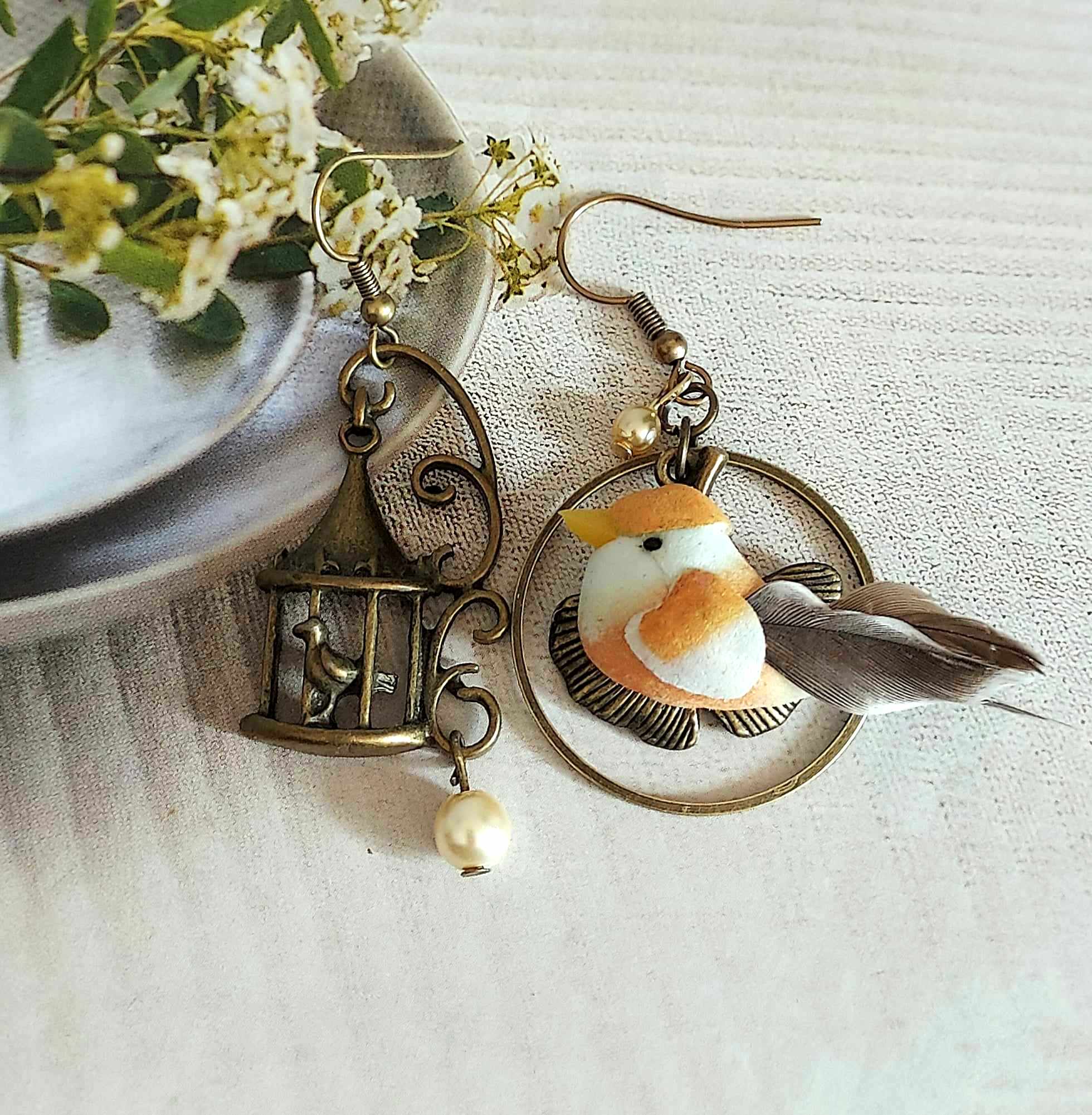 Boucles d’oreilles dépareillées, breloque cage oiseau et breloque oiseau sur feuille de ginkgo, perle beige irisée.