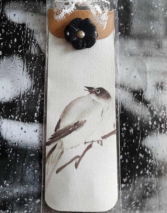 Marque pages avec 2 parties cartonnées et aimantées qui se rejoignent lorsqu’on insère le marque pages » à cheval » sur la page du livre; la partie haute reste à l’extérieur.