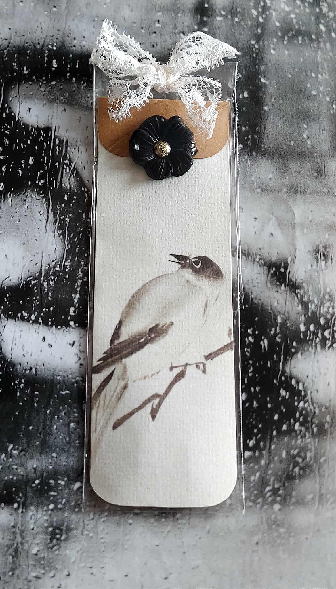 Carton découpé par mes soins, breloque acrylique fleur, nœud synthétique noir.
